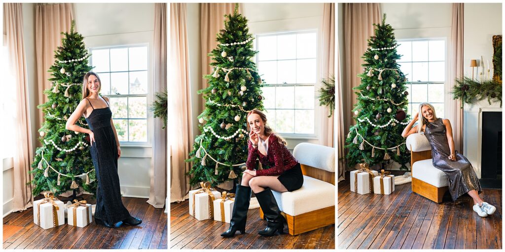 First up – the Christmas set. Wonderland Studio had a minimal but magical holiday backdrop that was perfect for cozy, classic shots. We started with individual portraits, then got creative with friend pics and group poses. I also grabbed a sweet trio shot of Jillian and her sisters – talk about a built-in legacy photo.